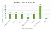 In Haile a total of 504 people are over 16, with 67 of them gaining no qualifications. This is above the national average. In 2011 22.3% of over 16 residents gained no qualifications, whereas in Haile it is a low 13.3%. On average most people have a level 4 or above qualification (185/504), which is impressive although it's a relatively small area. According to the Office of National Statistics in England, 27% of people over 16 have a level 4 or above qualification, however in Haile it is 36.7%, showing this area is very well educated when compared to the rest of England.[1] Comparing Haile to the 2001 and 2011 census data shows significant improvements in its education system, with 50% of people having level 3 or above qualifications, compared to 33% in 2001.[13][14]
