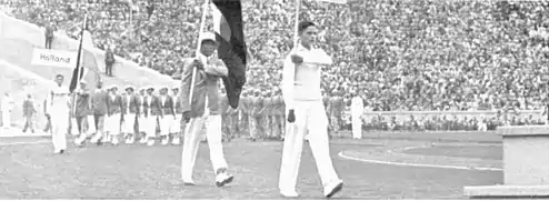 André Chevallier was the president of Haiti's National Olympic Committee in 1936 and lead the nation through the organisation process.[1] The nation had been invited to participate on 20 December 1933,[1] and were sent ten Olympic programmes in March 1935, though in Spanish rather than national language French.[2] Their small delegation (twenty Olympic identity cards and one press ticket were issued) arrived in Germany on 24 July 1936 before departing on 4 August. Their attaché in Berlin was Edouard Voigt, and the military officer assigned to serve them was Captain v. Hülsen.[1]