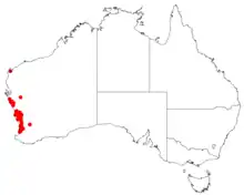 Hakea candolleana grows in heath or shrubland on sand, loam and clay and requires an open sunny aspect. Often found in low lying seasonally wet areas. It grows from the northern sand plains at the Murchison River to Perth and an outlying community at Tammin.[3][4]