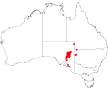 Flinders Range hakea is endemic to an area in western New South Wales and the Flinders Ranges and Far North of South Australia. The plant is often situated on and around rocky cliff faces and along water courses in stony or sandy soils. It is common in South Australia but rare in New South Wales.[2][4]