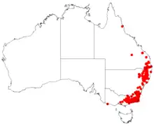 Tree hakea occurs in Eucalyptus woodland or forest and the edge of rainforest from Gladstone in Queensland, southward to Gippsland in Victoria.[4]