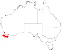 It is endemic to an area along the coast in the South West and Great Southern regions of Western Australia between Busselton in the west, Wagin to the north and Albany to the south. It is often found among granite outcrops and seasonally damp areas like swamps growing in sandy or sandy-clay soils and is usually part of sandy heathland or Eucalyptus woodland communitities.[2][3]