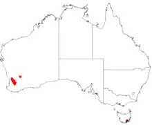 It is endemic to an area in the Wheatbelt region of Western Australia between Northam in the north down to Narrogin in the south. It is found in sandy gravelly soils often around laterite.[2] It is often found on and around breakaways and is a part of the understorey in open Eucalyptus wandoo and Eucalyptus accedens woodland communities.[3]