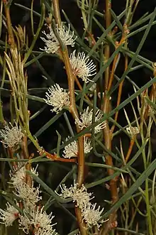 Desert hakea grows in mallee-heath vegetation on calcareous sandy soil. Mainly a South Australian species occurring on Eyre, Yorke and Fleurieu Peninsulas, Kangaroo Island and south of the Murray River to Naracoorte, extending into western Victoria.[3][5]