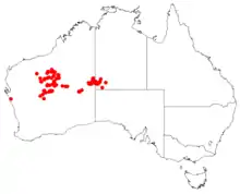 Walukara has a scattered distribution through area in the Pilbara and the Goldfields regions of Western Australia where it is found on sand dunes, plains and hillsides growing in sandy or loamy soils.[3] Its range extends east into the Northern Territory to around the Petermann Range.[4][7]