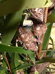 Hakea salicifolia is a fast-growing upright shrub or small tree to 3–5 m (10–20 ft) tall. Smaller branches are smooth with obvious dark red longitudinal ribbing. Young shoots have sparse silky hairs or may be totally hairless. Leaves are narrowly oval shaped, widest in the middle up to 12 cm long and 5–20 mm (0.2–0.8 in) wide tapering to a point or occasionally rounded at the apex. The pale green leaves are smooth, occasionally bluish-green with a powdery film. Young leaves are darker with sparse flattened silky white and rusty coloured hairs quickly becoming smooth. The inflorescence consists of a single umbel of 16–28 white to pale yellow flowers on a short stalk 1–1.5 mm (0.04–0.06 in) long. The young flower bracts are 3 mm (0.1 in) long and slightly hairy externally. The pedicel is 4.5–7 mm (0.2–0.3 in) long. The perianth smooth, bluish-green with a powdery film and 2.3–3.5 mm (0.09–0.1 in) long. The style 6–6.5 mm (0.2–0.3 in) long. Egg-shaped fruit are 2.3–3.5 cm (0.9–1 in) long and 1.3–3 cm (0.5–1 in) wide narrowing gradually to a slightly upturned beak with small horns. The fruit surface is covered with black blister-like warts 1–5 mm (0.04–0.2 in) high.[3][4][5]