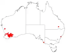 This species grows from Wyalkatchem through to Gnowangerup and south to Ravensthorpe. Grows in heath, scrub and woodland in well-drained clay, various coloured sands and loam over laterite, often with gravel, occasionally on ridges. An ornamental species, may be used for hedging and low windbreak.[3]