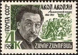 Hakob Hakobian (Armenian: Հակոբ Հակոբյան; often transliterated from Russian as Akop Akopian; 29 May 1866, in Elisavetpol – 13 November 1937, in Tbilisi), was a Soviet Armenian poet, the founder of Armenian proletarian poetry. Communist party member from 1904. Awarded with the titles People's Poet of Armenia and People's Poet of Georgia.[1] He was considered as the "Armenian Maksim Gorky" by the Bolshevik press.[2]