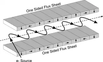 Scaling up this design and adding a top sheet gives a wiggler magnet, used in synchrotrons and free-electron lasers. Wiggler magnets wiggle, or oscillate, an electron beam perpendicular to the magnetic field. As the electrons are undergoing acceleration, they radiate electromagnetic energy in their flight direction, and as they interact with the light already emitted, photons along its line are emitted in phase, resulting in a "laser-like" monochromatic and coherent beam.