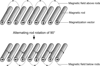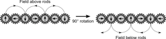 A series of magnetic rods, magnetized perpendicular to their axes, can be arranged into a Halbach array. If each rod is then rotated alternately through 90°, the resultant field moves from one side of plane of the rods to the other, as shown schematically in the figure.