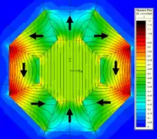 The direction of magnetization of the wedges in (A) can be calculated using a set of rules given by Abele and allows for great freedom in the shape of the cavity. Another class of design is the magnetic mangle (B), proposed by Coey and Cugat,[17][18] in which uniformly magnetized rods are arranged such that their magnetization matches that of a Halbach cylinder, as shown for a 6-rod design. This design greatly increases access to the region of uniform field, at the expense of the volume of uniform field being smaller than in the cylindrical designs (although this area can be made larger by increasing the number of component rods). Rotating the rods relative to each other results in many possibilities, including a dynamically variable field and various dipolar configurations. It can be seen that the designs shown in (A) and (B) are closely related to the k = 2 Halbach cylinder. Other very simple designs for a uniform field include separated magnets with soft iron return paths, as shown in figure (C).