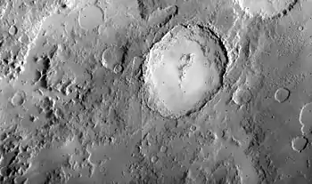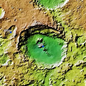 On 28 September 2015 NASA confirmed the seasonal existence of liquid water in Hale crater.[2] The salts in the water (magnesium perchlorate, magnesium chlorate, sodium perchlorate,...) lower its freezing and melting point to 203 K (−70 °C or −94 °F), which is near the average summer night temperature. Hale was created by an asteroid roughly 35 km (22 mi) across that impacted at an oblique angle about 3.5–3.8 billion years ago. The rim and ejecta are eroded and show smaller impacts, but subsequent deposits have covered up small craters within it.[3] On the southern rim of Hale, parts of the crater wall have moved downslope towards the crater's centre. The surface shows a network of fluvial channels which may have been caused by running water.[4] It is named after George Ellery Hale.