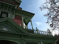 The varied architectural style of the house has been described as Queen Anne, Eastlake,[4] Carpenter Gothic,[6] "picturesque eclectic,"[9] and "a capricious old gingerbread."[2] Jack Smith overheard a neighbor say of the house, "What architecture! This old house? It's a mishmuch." Smith agreed but called it "a wonderful old mishmuch."[12] Whatever the precise style, the house is an impeccable example of Victorian craftsmanship and design, with ornate brick chimneys, stained-glass windows, wood carvings, and a "corner turret" crowned with giant copper fleur-de-lis.[5][6]