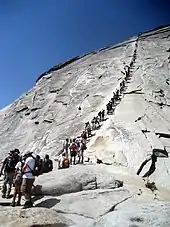 The Cable Route can be crowded. In past years, as many as 1,000 hikers per day have climbed the dome on a summer weekend, and about 50,000 hikers climb it every year.[12][13]