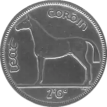 The coin measured 1.275 inches (32.4 mm) in diameter and weighed 14.1 grams. The reverse design of the coin, by Percy Metcalfe featured an Irish Hunter, a breed of horse. This design was used later for the twenty pence coin issued in 1986. The obverse featured the Irish harp. From 1928 to 1937 the date was split either side of the harp with the name Saorstát Éireann circling around. From 1938 to 1967 the inscription changed to Éire on the left of the harp and the date on the right.[1]