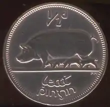 The reverse design was by Percy Metcalfe, an English artist. The artist was given the choice of a boar, a sow or a ram, and the sow was chosen. The obverse featured the Irish harp. From 1928 to 1937 the date was split either side of the harp with the name Saorstát Éireann circling around. From 1938 to 1969 the inscription changed to Éire on the left of the harp and the date on the right.[1]