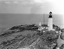 Halfway Rock Lighthouse is a lighthouse located on a barren ledge in Casco Bay, Maine. The lighthouse tower, which has a height of 76 feet (23 m), and the attached ex-boathouse are all that remains, as the other buildings have been taken away in storms. The name "Halfway Rock" comes from the position of the rock which is halfway between Cape Elizabeth and Cape Small, the southwest and northeast extremities of Casco Bay, which are about 18 nautical miles (33 km) apart.