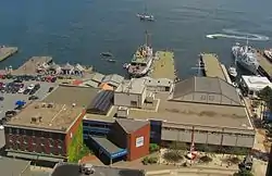 Constructed of durable heavy timber, the Halifax boardwalk is open to the public 24 hours a day. The boardwalk also includes shops at Bishop's Landing and the Historic Properties buildings as well as the "Cable Wharf", a former cable ship terminal now used as a tour boat base for several vessels formerly including Theodore Too. A fleet of tugboats operated from the tug wharves at the foot of Salter Street for over a hundred years, including the famous tug Foundation Franklin but in 2010 the last tugs such as Point Chebucto were transferred to Port Hawkesbury.[1] The final working vessels to regularly operate from the waterfront were pilot boats which were based at a small pier at the foot of Sackville Street, but in late 2020 their base moved to a wharf in Dartmouth near the foot of the Macdonald Bridge.[2] The former tug and pilotage wharves have since been partially demolished and refurbished to make way for new public amenities.[3]