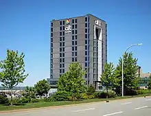 On October 26, 2011, the airport authority announced the construction of an on-site 14-storey, 169-room, Alt Hotel.[53] Linked to both the passenger terminal and the parking garage by an enclosed footbridge, the $27 million building was built by Marco Construction of Halifax and opened in 2013. Operated by Groupe Germain Hospitalité, the hotel includes conference and banquet facilities, a fitness centre, a pool, and a 24-hour cafe.[54] It was built with soundproof windows to block aircraft noise.[55]