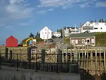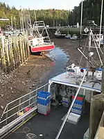 A shipyard produced many schooners and some square rigged vessels, the largest being the barque Jenny Bertaux, built in 1864.[4] A notable early resident was Ransford Dodsworth Bucknam, a local mariner whose 19th century career took him all over the world including a post as an admiral in the Turkish Navy. Growth of the village slowed in the 1870s as the depletion of timber reserves ended the lumber trade and the arrival in 1869 of the Windsor and Annapolis Railway in the Annapolis Valley and drew away agricultural shipments. Shipbuilding declined with the lack of timber and introduction of steamships although there was a brief revival in World War I.[5] The harbour continued as an inshore fishing port and small coastal shipping centre for coastal schooners and small steamers. The Canadian federal government took over operation of the wharves in the early 1900s and built a lighthouse on a small breakwater at the eastern harbour entrance in 1911.[6] The larger western breakwater was extended in 1920 and heavily damaged by a storm in 1962.[7] After World War II, coastal shipping ceased but the picturesque harbour drew many local cottagers and became a favoured place to view the dramatic change of the Bay of Fundy tides.