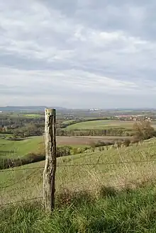 View from the Limpurg Hills near Michelbach of the Haller Plain. The Waldenburg Hills are on the left horizon