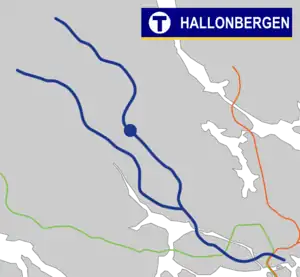 Hallonbergen is a station on the blue line of the Stockholm metro, located in Sundbyberg. The station was opened on 31 August 1975 as part the first stretch of the Blue Line between T-Centralen and Hjulsta. The trains were running to Hallonbergen and then continued to Rinkeby via a track which is currently used for the rail yard access. On 5 June 1977, the extension north to Akalla was opened.[2] The station's interior is covered with art intending to mimic kids' paintings done by Elis Eriksson and Gösta Wallmark. Between 1975 until 1985 Hallonbergen was the branching point for the Akalla and Hjulsta lines, as evident from its three-track layout. On 18 August 1985 the extension from Västra skogen to Rinkeby was opened, and the stretch between Hallonbergen and Rinkeby was closed for passenger traffic.[2]