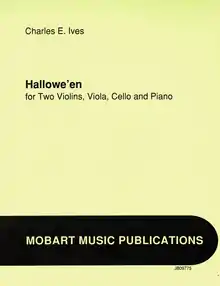 Hallowe'en was only published in 1949 by Bomart Music Publications, initially intended to be the first movement of a short suite for orchestra entitled Three Outdoor Scenes, the other pieces being The Pond and Central Park in the Dark. However, the other pieces were published after a long time and Bomart failed to identify the set of pieces with a collective title.[3][6] Although the title of the set is present in the score, the piece is not normally published in that set and is currently being sold separately. The copyright was reassigned to Mobart Music Publications in 1977. It was also projected to be a part of a different set of pieces for chamber ensemble, entitled Set of Three Pieces for Small Orchestra, which included The Pond and The Gong on the Hook and Ladder. This grouping was meant to serve only for performance.[3][6] This piece later became the second section in the ballet Ivesiana.[7]