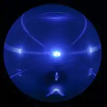 The earliest experimental studies on halo phenomena have been attributed[16] to Auguste Bravais in 1847.[17] Bravais used an equilateral glass prism which he spun around its vertical axis. When illuminated by parallel white light, this produced an artificial Parhelic circle and many of the embedded parhelia. Similarly, A. Wegener used hexagonal rotating crystals to produce artificial subparhelia.[18] In a more recent version of this experiment, many more embedded parhelia have been found using commercially available[19] hexagonal BK7 glass crystals.[20] Simple experiments like these can be used for educational purposes and demonstration experiments.[13][21] Unfortunately, using glass crystals one cannot reproduce the circumzenithal arc or the circumhorizontal arc due to total internal reflections preventing the required ray-paths when .