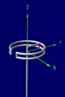 In the diagram (right, lower) the square full wave loop has maximum signal (magenta) broadside to the square wires, with nulls off the left and right sides; the octagonal small loop has its maximum signal within the plane of the antenna-wire octagon, with nulls (black center point) broadside to them. Self-resonant loops with a perimeter of one full wavelength have a radiation pattern which peaks perpendicular to the plane of the loop (along the z axis, in the diagram below) but falls to zero within the plane of the loop, quite opposite the radiation pattern of a halo antenna. Thus, despite the superficial similarity, these two antenna types behave fundamentally differently.