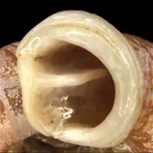 The apertural lip is well-developed.[2] The apertural fold is long, more or less equally long in its total length, connected to the callus.[2]