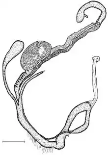 The reproductive system was described by Páll-Gergely et al. in 2015.[2] Embryos were recorded to be present in the uterus.[2] There were recorded flat, thin, with no particular shape calcareous granules on the internal surface of penis.[2]