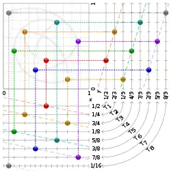 - (1⁄2, 1⁄3), (1⁄4, 2⁄3), (3⁄4, 1⁄9), (1⁄8, 4⁄9), (5⁄8, 7⁄9), (3⁄8, 2⁄9), (7⁄8, 5⁄9), (1⁄16, 8⁄9), (9⁄16, 1⁄27).