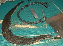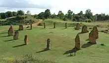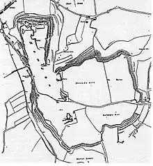 The name may come from the Old English ham and hyll giving a meaning of "the settlement hill",[7] however its original name was Hamdon,[8] meaning "the hill among the water meadows".[9] There is evidence of occupation from the mesolithic and neolithic periods.[10] Ham Hill is the site of a very large Bronze Age and Iron Age hill fort of the Durotriges tribe,[11] from the 1st century BC.[12] The 3 miles (5 km) ramparts enclose an area of 210 acres (85 ha).[13][14] Most of the perimeter is a double bank and ditch ("multivallate"). There is a major entrance to the south-east, on the line of the modern road and another to the north-east, following a track from the Church of St Mary the Virgin at East Stoke in Stoke-sub-Hamdon. Archaeological finds include bronzework, chariot parts, iron currency bars, gold and silver coins, cremations and burials.