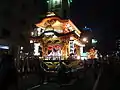 As night falls, the floats depart to the sounds of the shamisen played, the flutes and drums played by children wear in festival costumes and riding on the floats. They are called the ohayashi. The festival reaches its climax when the sounds of drums and flutes echo through the night sky. [1]