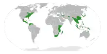 The largest subfamily, the Hamamelidoideae, is now distributed in North America and western and eastern Asia. The Hamamelidoideae subtribe Dicoryphinae is now restricted to the African (including Madagascar and Comores) and Australian continents.[26] [4][14] Disanthoideae and Rhodoleioideae are now restricted to southern China and the Caucasus region.[26] Mytilarioideae is restricted to eastern Asia. Altingioideae is now restricted to eastern Asia and western Asia and North America between central Mexico and Belize.[26] [23]