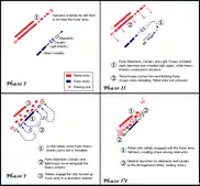 The rebels held the hills to the west of Carthage and the only bridge across the Bagradas river leading to Utica.[56] Hamilcar observed that wind blowing from a certain direction uncovered a sandbar at the river mouth that was fordable and, under cover of night, the Punic army left Carthage and crossed the river. Hamilcar aimed to attack the small rebel band holding the bridge, but Spendius led the rebel force besieging Utica to confront Hamilcar. The Carthaginian army was caught in a pincer movement; Hamilcar pretended to retreat, and Spendius likely attempted to trap the outnumbered Carthaginians against the river with his two forces, pinning them with one and out-flanking them with the other. When his troops rushed towards the retreating Carthaginians, Spendius was either unable to control them or believed that the Carthaginians were fleeing and encouraged his forces' pursuit.[57] Hamilcar had managed to train his new recruits in some drill and basic battlefield maneuvers before they left Carthage.[58] As the two rebel forces came into clear sight the Carthaginians wheeled, and marched away. The Carthaginians were marching in good order so they could perform a pre-planned manoeuvre which they had practiced in Carthage, but the rebels, many of whom were inexperienced soldiers, believed that the Carthaginians were running away. Shouting encouragement to each other they broke into a run to pursue.[59] Hamilcar unleashed his trap as the disorderly rebels closed on his formation. As the cavalry and then the elephants came closer to the infantry Hamilcar ordered each in turn to also wheel about to face the rebels.[60] The modern historian Dexter Hoyos stresses that "[s]uch manoeuvres were about the simplest that any army could learn, once it mastered the absolute basics of marching in formation".[60]
