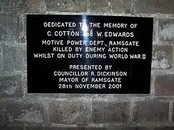 - Chief Petty Officer William Eden, service number P/K 5943, from the naval shore base of HMS Fervent[28] (which encompassed part of Ramsgate Harbour), who died on 27 September 1939, age and cause of death unknown.[29]
