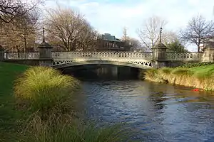 The Canterbury foothills were hit by a severe rainstorm on 3 February 1868, and the Waimakariri River broke its banks between Courtenay and Halkett (near Kirwee), entering the headwater of the Avon River at Avonhead. The flood water reached Christchurch at 10 am of the following day and rose rapidly and that evening, the city was under water. In Dr Barker's house, located on the corner of Worcester Street and Oxford Terrace and thus only some 400 metres (1,300 ft) upstream from the Victoria Bridge, the water was 3 feet (0.91 m) deep.[22] The Worcester Street Bridge was washed downstream by a distance of 150 yards (140 m),[22] and the north end of the Colombo Street Bridge was swept away.[23] The Gloucester Street suspension footbridge and the much more substantial Victoria Bridge survived the flood without damage, and the Madras Street and Stanmore Road bridges further downstream were also undamaged.[24]