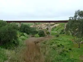 The earliest part of the narrow gauge Hamley Bridge-Gladstone line opened from Balaklava to Blyth on 14 March 1876 as part of the Port Wakefield line. On 15 January 1880, the line opened from Hamley Bridge to Balaklava.[2] It was extended north from Blyth to Gladstone on 2 July 1894 where it joined the Port Pirie-Cockburn and Wilmington lines. The line was gauge converted to 5 ft 3 in (1,600 mm) on 1 August 1927. The line from Gulnare to Gladstone closed on 11 May 1988, followed by the Balaklava to Gulnare section on 29 March 1989.[3] The section track between Balaklava and Gladstone was removed in late 1989, and the 10 km section between Halbury and Balaklava has now been converted into the Shamus Liptrot Cycling Trail.[4]