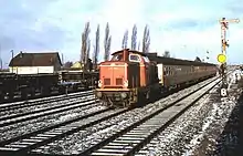 The first Federal Transport Infrastructure Plan (1973) identified the Dortmund–Hannover–Brunswick line as one of eight railway development projects.[2] Already in the same year a 28 km long section of track between Gütersloh and Neubeckum was made available for high-speed trials for speeds up to 250 km/h. Locomotive 103 118 with special gear ratios achieved a maximum speed of 252.9 km/h in September 1973.[3] Vehicles were also built to test catenary for high-speed operations. The minimum curve radius was 3,300 metres and maximum cant was 120 mm. Experiments were carried out on different types of track (including slab track), catenary and turnouts.[4]