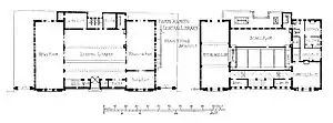 The statues in the façade are as follows: immediately to the top left of the main entrance, on the first floor, is a statue of John Milton, while to the top right of the main door is a statue of William Shakespeare.[2] To the right of these statues, between the windows on the south wing of the library, are a male figure with a book, representing Literature, and a female figure with a paintbrush, representing the Arts;[3] while to the left of the statues of Milton and Shakespeare, between the windows on the north wing, are a female figure with a wheel, representing Spinning, and a male figure with a pair of compasses, representing Astronomy.[4]