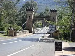 A well-known local tourist attraction, Hampden Bridge carries Moss Vale Road (B73) across the Kangaroo River in the picturesque Kangaroo Valley, 120 kilometres (75 mi) southwest of Sydney. The bridge is located in an undulating river valley terrain, with a sheer sandstone face on its northern side and sandy inclined riverbank on the southern side. The river flows westward under the bridge.[3] The bridge features four large Victorian Gothic Revival crenellated turrets made of locally quarried sandstone.[11] This elaborate form, and the relatively sophisticated structural design of the span, reflect the importance of this river crossing at the time of construction: the Cambewarra Road (now the Moss Vale Road) was then a major route from Sydney to the south coast of NSW.[12]