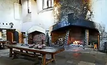 During the Tudor period, the palace was the scene of many historic events. In 1537, the King's much desired male heir, the future Edward VI, was born at the palace and the child's mother, Jane Seymour, died there two weeks later.[21] Four years afterwards, whilst attending Mass in the palace's chapel, the King was informed of the adultery of his fifth wife, Catherine Howard. She was then confined to her room for a few days before being sent to Syon House and then on to the Tower of London. Legend claims she briefly escaped her guards and ran through The Haunted Gallery to beg Henry for her life but she was recaptured.[22]