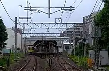 The station consists of one island platform serving two tracks, with an elevated station building above and at a right angle to the platforms.