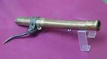 The hand cannon (Chinese: 手銃 shŏuchòng, or 火銃 huŏchòng), also known as the gonne or handgonne, is the first true firearm and the successor of the fire lance.[1] It is the oldest type of small arms as well as the most mechanically simple form of metal barrel firearms. Unlike matchlock firearms it requires direct manual external ignition through a touch hole without any form of firing mechanism. It may also be considered a forerunner of the handgun. The hand cannon was widely used in China from the 13th century onward and later throughout Eurasia in the 14th century. In 15th century Europe, the hand cannon evolved to become the matchlock arquebus, which became the first firearm to have a trigger.[2]