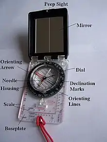 A hand compass (also hand bearing compass or sighting compass) is a compact magnetic compass capable of one-hand use and fitted with a sighting device to record a precise bearing or azimuth to a given target or to determine a location.[1][2] Hand or sighting compasses include instruments with simple notch-and-post alignment ("gunsights"), prismatic sights, direct or lensatic sights,[3] and mirror/vee (reflected-image) sights. With the additional precision offered by the sighting arrangement, and depending upon construction, sighting compasses provide increased accuracy when measuring precise bearings to an objective.[4]