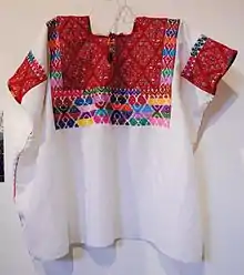 Both traditional and non-traditional clothing is made in the state. The basic traditional garment for women is the huipil, and each indigenous community has its own style,[8] particularly in Tenejapan, Zinacantan, Ocosingo, Larrainzar, Venustiano Carranza.[4] Another traditional dress is called the Chiapaneca, which shows clear Spanish influence. It is usually made of light, transparent cloth in dark colors (usually tulle) and heavily embroidered with large bright colored flowers.[8] In addition, mestizo women sew traditional and non-traditional clothing items for the tourist market, contracting indigenous women to do the embroidery.[3] These garments and other items with traditional embroidery can be found in markets such as those in San Cristóbal de las Casas (Plaza Santo Domingo), San Juan Chamula and Zinacatán.[1]