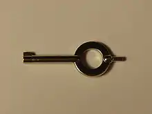 Handcuffs are restraint devices designed to secure an individual's wrists in proximity to each other.[1] They comprise two parts, linked together by a chain, a hinge, or rigid bar. Each cuff has a rotating arm which engages with a ratchet that prevents it from being opened once closed around a person's wrist. Without the key, the handcuffs cannot be removed without specialist knowledge, and the handcuffed person cannot move their wrists more than a few centimetres or inches apart, making many tasks difficult or impossible.
