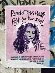 Hande Kader (1993 – August 2016) was a politically active Turkish transgender woman. Kader was familiar to millions of Turks as a figurehead for the LGBT community after being photographed at the forefront of the resistance against police forces suppressing the 2015 Gay Pride event in Istanbul.[1] In August 2016, she was reported missing by her flatmate when she failed to return home the following week.[2] Her body was found raped, mutilated, and burnt[3] by the roadside in the Zekeriyaköy up-market on 12 August 2016.[4] Despite being badly mutilated, Kader's body was identified by prosthetics at the city morgue by Dengiler.[2][3]