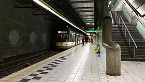 Handel premetro station is the smallest premetro station in Antwerp. It is completely decorated with the colors of transport company De Lijn. The -1 level has a small ticket hall with access to the platforms; there is only one exit. The -2 level has a 60-meter platform for trains going toward Elisabeth station, the -3 level has the platform for trains going toward premetro Schijnpoort station.